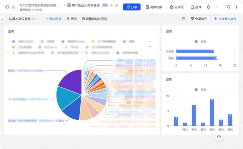 由于器械字號產(chǎn)品的特殊性,現(xiàn)在敷爾佳通過飛書在線文檔審批達(dá)人,將達(dá)人數(shù)據(jù)填寫上報,上級在線同步審批達(dá)人,跟進(jìn)確定合作。直播中,用飛書云盤儲存資料,將達(dá)播錄屏,產(chǎn)品資料等數(shù)據(jù),同步云盤,方便各部門查看,調(diào)取相關(guān)資料。直播后,利用飛書多維表格將達(dá)人信息,合作傭金,產(chǎn)出 GMV,對接人等重要信息歸攏一起,形成多維表格方便組織內(nèi)互相查閱填寫, 通過儀表盤的功能體現(xiàn)出哪些達(dá)人是優(yōu)質(zhì)合作達(dá)人,并為二次投放合作提供了參考價值。