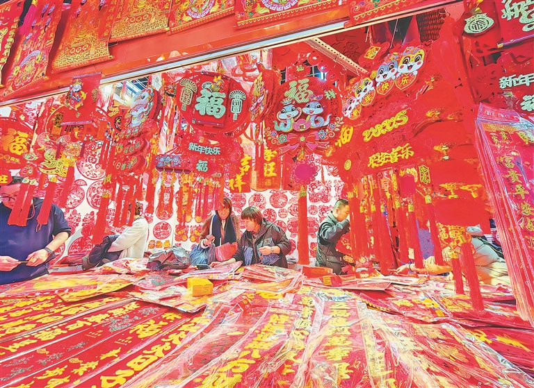 春節(jié)臨近,哈爾濱市道里區(qū)一處批發(fā)市場(chǎng)內(nèi),市民們正在購(gòu)買(mǎi)各種節(jié)日飾品,用來(lái)裝點(diǎn)家居,迎接新春佳節(jié)的到來(lái)。蛇年主題的燈籠、對(duì)聯(lián)、福字等擺滿(mǎn)了柜臺(tái),紅紅火火,喜慶氣氛濃厚。人們臉上都洋溢著幸福的笑容,一邊逛一邊買(mǎi),個(gè)個(gè)滿(mǎn)載而歸。