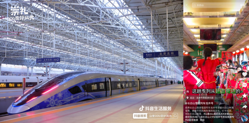 在線下,活動還聯(lián)動崇禮區(qū)政府、延邊州商務局、齊齊哈爾網(wǎng)信辦落地雪國專列,覆蓋復興號、民俗專列、高鐵站等不同場景,讓游客和市民感受濃濃冰雪氛圍,自發(fā)為當?shù)匚穆梅N草,吸引更多雪友來到小城看見好風光。截至活動收官,“開往崇禮站的雪國專列”熱度達827萬,一度登上抖音河北多地同城榜TOP1。