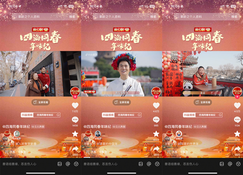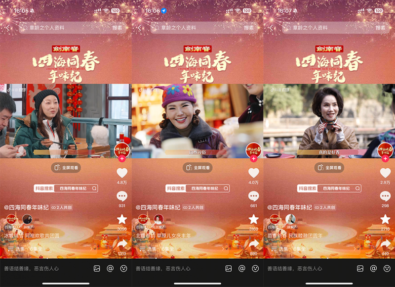 為紀念首個“非遺版春節(jié)”,由抖音出品、中國名酒劍南春冠名的春節(jié)主題紀錄片《四海同春年味紀》邀請多位明星來到家鄉(xiāng)或向往的城市,體驗當?shù)靥厣晡?。紀錄片于1月22日-1月27日,通過抖音、抖音精選、今日頭條、西瓜視頻、鮮時光等平臺播出。截至收官,該片正片播放量超1億,抖音話題播放量破2.3億,全網(wǎng)曝光達10億,相關(guān)話題多次登上平臺熱榜。