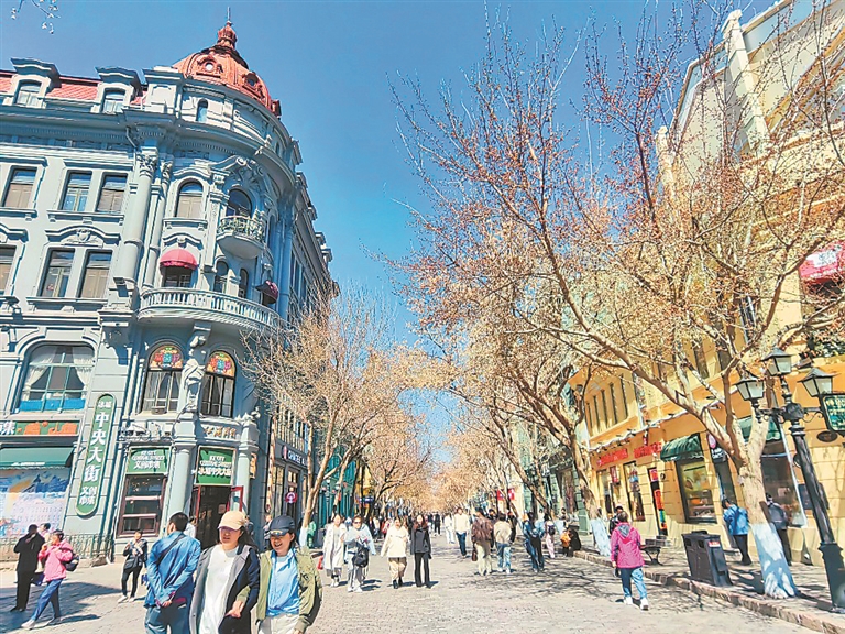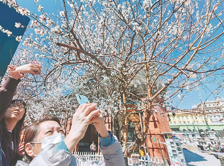 近日,哈爾濱市天空晴朗,空氣優(yōu)良,人們紛紛外出活動(dòng),盡享美好的春光。在松花江畔、中央大街、建筑藝術(shù)廣場,市民游客有的在觀賞美麗江景,有的在逛街購物,有的在拍攝盛開的桃花。