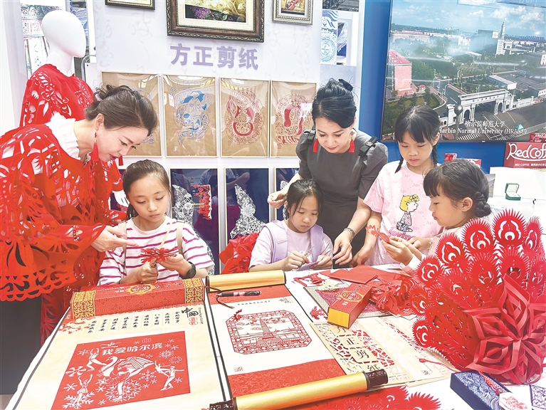方正剪紙展區(qū)工作人員把剪紙穿在身上,手把手輔導(dǎo)小觀眾體驗剪紙技藝。本報記者 韓東賢攝