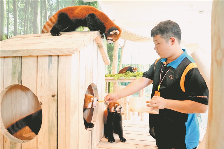 小熊貓是國家二級(jí)保護(hù)動(dòng)物,野外種群數(shù)量不足萬只。保育員團(tuán)隊(duì)精心準(zhǔn)備小熊貓的飲食,專門從四川空運(yùn)新鮮竹子并搭配多種營養(yǎng)餐食,確保小熊貓們健康成長。本報(bào)記者 董廣碩攝