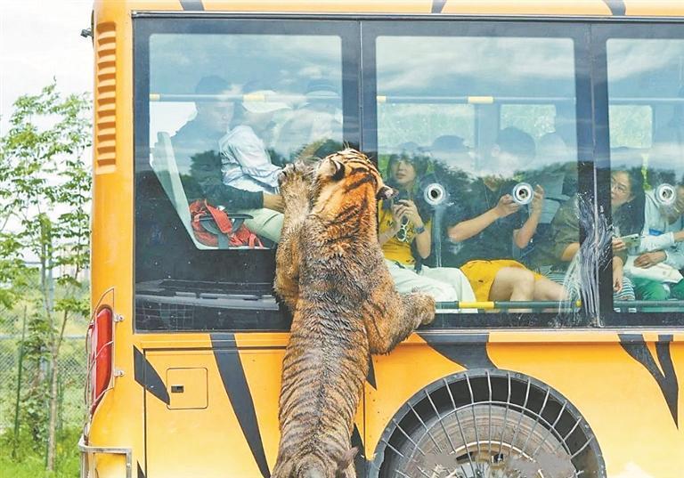 在驚險(xiǎn)觀(guān)光車(chē)上,游客可以通過(guò)特制裝置給成年虎投喂食物,體驗(yàn)“虎口投食”的刺激。“從來(lái)沒(méi)想過(guò)能這么近距離接觸東北虎,看著它從我手中的夾子吃肉,既緊張又激動(dòng)!”來(lái)自上海的大學(xué)生語(yǔ)氣難掩興奮。