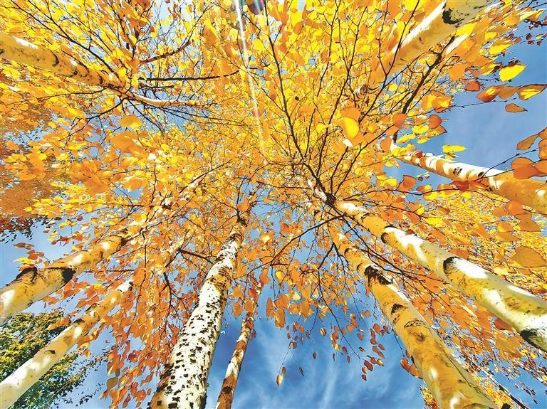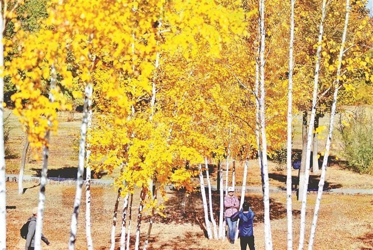 12日,哈爾濱市道里區(qū)麗江路附近的松花江畔,一小片白樺林吸引人們駐足觀賞、拍照。深秋的白樺樹,樹干筆直高聳,樹皮潔白如紙。枝頭的葉子已經由綠色變成了金黃色,在陽光的照耀下,色彩濃重,景色迷人。本報記者 蘇強攝