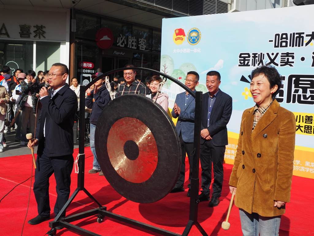 受贈方香坊區(qū)幸福鎮(zhèn)哈藥希望小學校長劉壯現(xiàn)場介紹了這所希望小學留守兒童的情況。開幕式最后,黃磊理事長和張靜萍書記一同敲響大鑼,鳴鑼開市。
