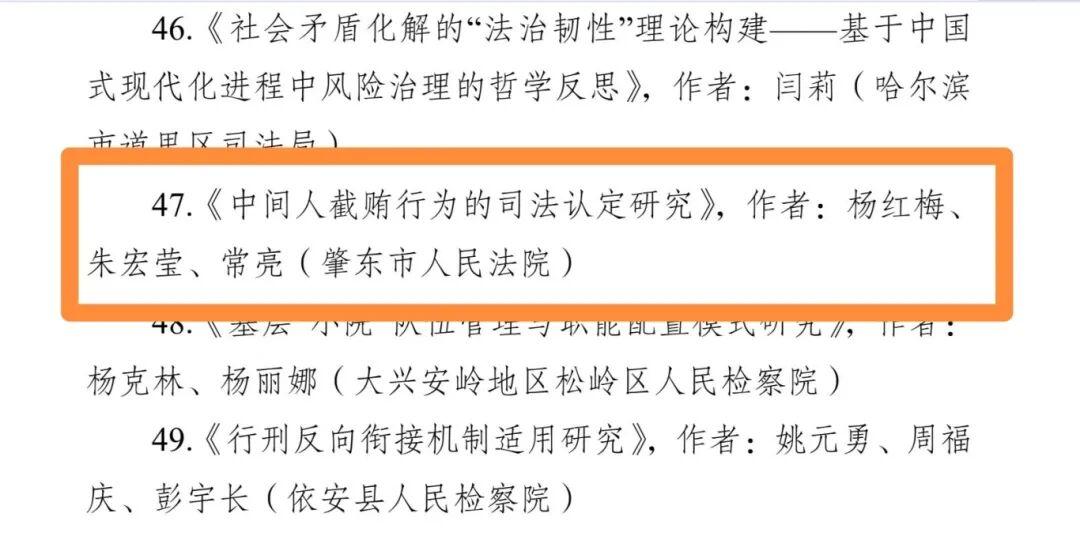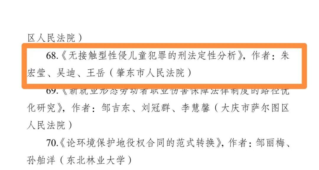 其中,督察室負(fù)責(zé)人楊紅梅、審管辦副主任朱宏瑩、審管辦副主任常亮撰寫的論文《中間人截賄行為的司法認(rèn)定研究》,榮獲三等獎(jiǎng);審管辦副主任朱宏瑩、五站人民法庭負(fù)責(zé)人吳迪、審管辦書記員王岳撰寫的論文《無接觸型性侵兒童犯罪的刑法定性分析》,榮獲優(yōu)秀獎(jiǎng);刑庭法官助理張瑩、刑庭庭長王帝撰寫的論文《涉訴信訪治理機(jī)制研究》,榮獲優(yōu)秀獎(jiǎng)。