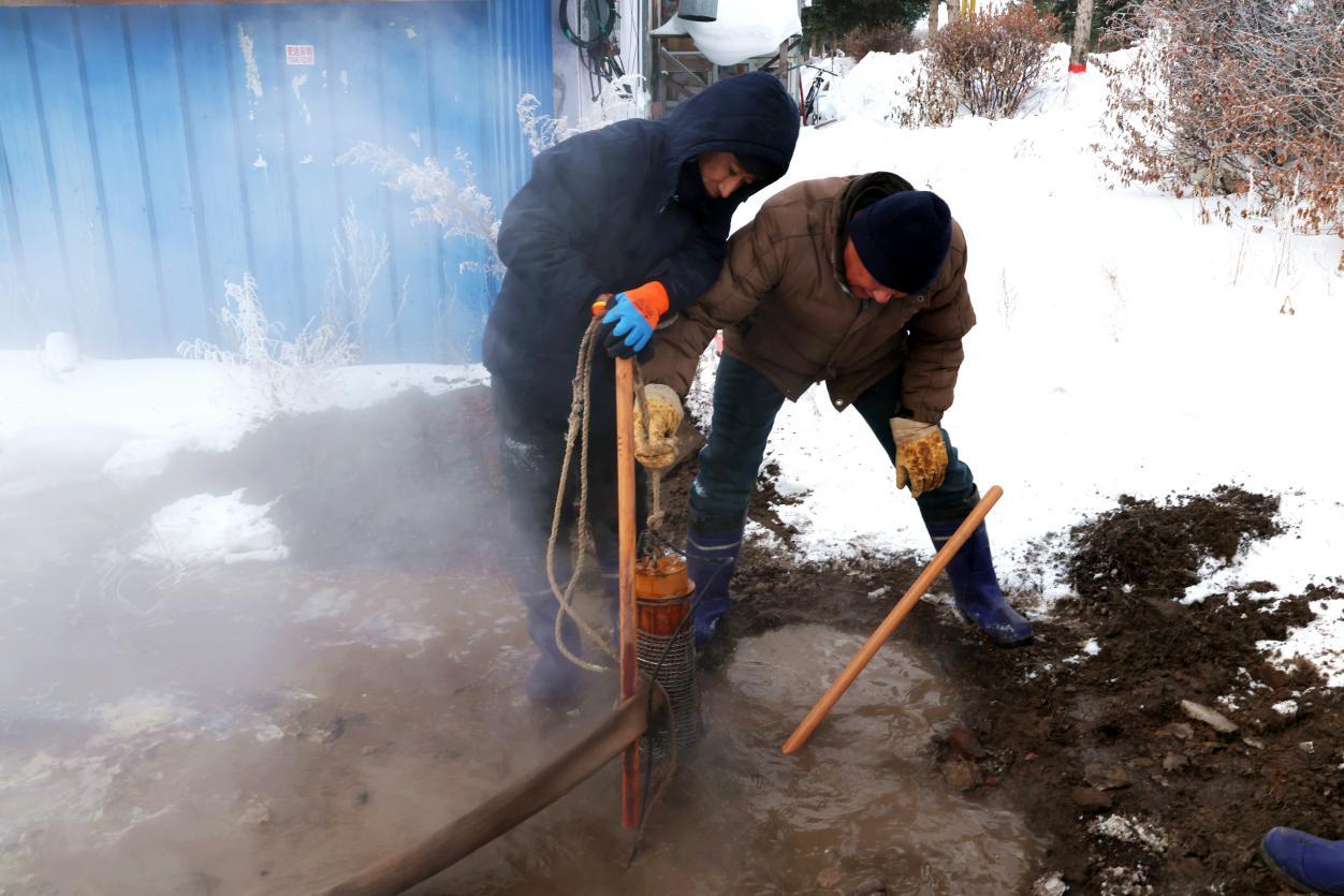 因地下管線錯綜復雜,且極寒天氣易導致管道凍裂,搶修人員采取邊供暖、邊排水、邊人工開挖的方式推進作業(yè),防止管線被凍擴大輻射面。地面破開后熱水持續(xù)涌出,搶修人員輪番上陣,清理凍土、排查漏點,歷經(jīng)3小時奮戰(zhàn),至11時40分挖出1.8立方米深坑,精準定位漏點為供暖分線軟接頭老化,此時跑水量已達每小時4噸。為控制漏損,搶修人員當即關閉分線閥門,受此影響,周邊20余戶居民供暖暫時中斷。