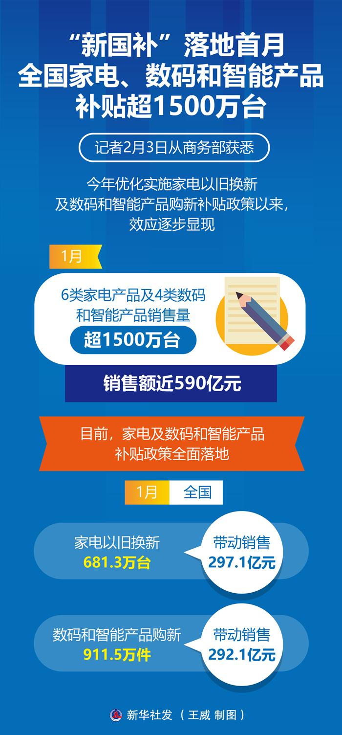 記者2月3日從商務部獲悉,今年優(yōu)化實施家電以舊換新及數(shù)碼和智能產品購新補貼政策以來,效應逐步顯現(xiàn)。1月,6類家電產品及4類數(shù)碼和智能產品銷售量超1500萬臺,銷售額近590億元。