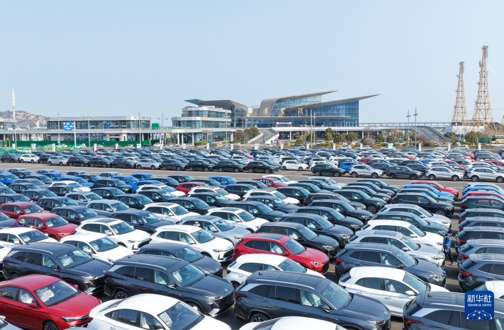 ??3月10日拍攝的江蘇省連云港港出口汽車(chē)堆場(chǎng)(無(wú)人機(jī)照片)。新華社發(fā)(王健民攝)