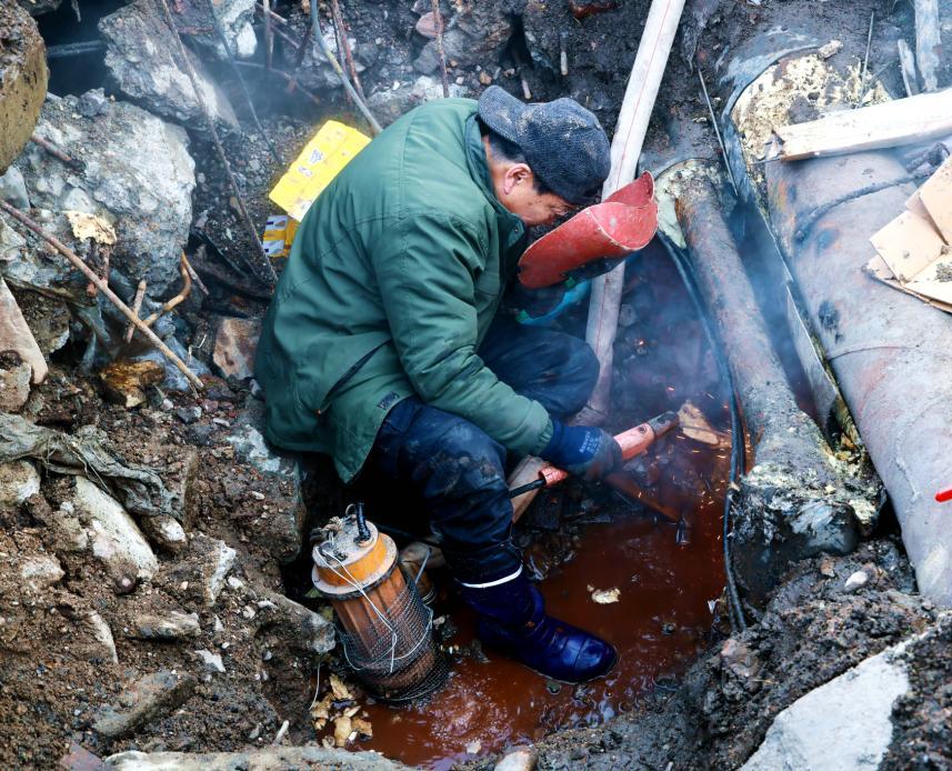 搶修現(xiàn)場,機械與人力協(xié)同發(fā)力。小型挖掘機破土作業(yè),挖開近2米深的作業(yè)面,精準定位蒙板漏水點。10余名搶修人員腳穿水靴,一邊操作水泵排水,一邊用鍬鎬擴大作業(yè)空間,爭分奪秒推進搶修進程。為搶抓進度,搶修人員放棄午休和周日休息,全程堅守一線,先后完成開口、安裝臨時閥門等關鍵工序,待供暖主管水凈后,迅速開展焊接作業(yè),精準修復10多公分長的破裂處,最終完成焊接、保溫及現(xiàn)場恢復工作。