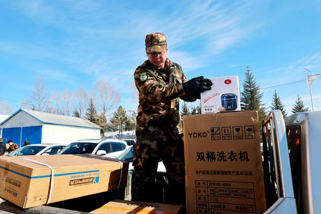 阿木爾林業(yè)局林場職工正在將領(lǐng)取的物品裝車(王力 攝)