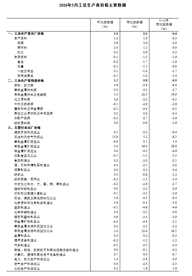 2026年3月份,全國工業(yè)生產(chǎn)者出廠價格同比由上月下降0.9%轉(zhuǎn)為上漲0.5%;環(huán)比上漲1.0%,漲幅比上月擴大0.6個百分點。工業(yè)生產(chǎn)者購進(jìn)價格同比由上月下降0.7%轉(zhuǎn)為上漲0.8%;環(huán)比上漲1.2%,漲幅比上月擴大0.5個百分點。一季度,工業(yè)生產(chǎn)者出廠價格比上年同期下降0.6%,工業(yè)生產(chǎn)者購進(jìn)價格下降0.5%。