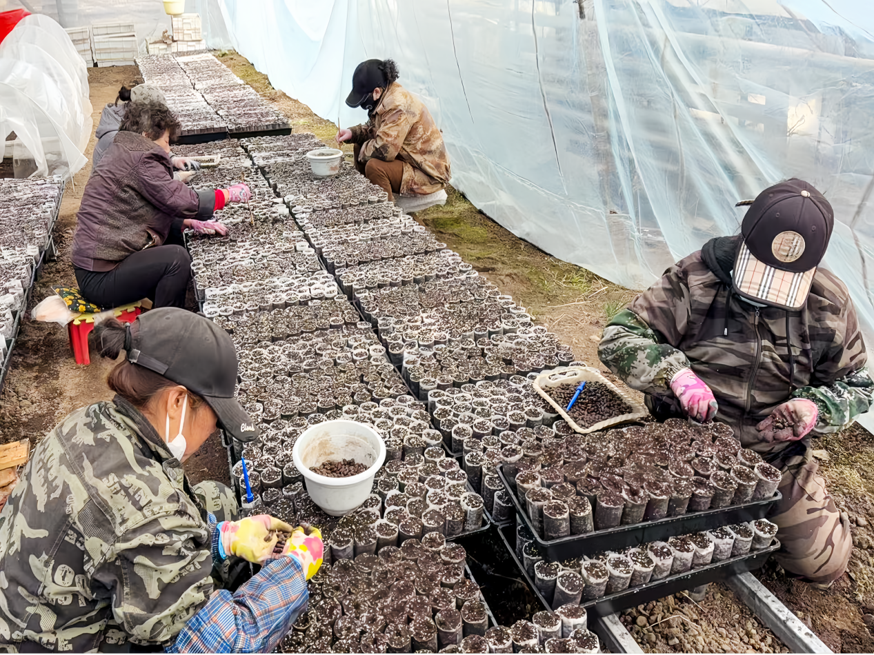 工作人員把西伯利亞紅松種子種入輕基質(zhì)杯(劉磊 攝)