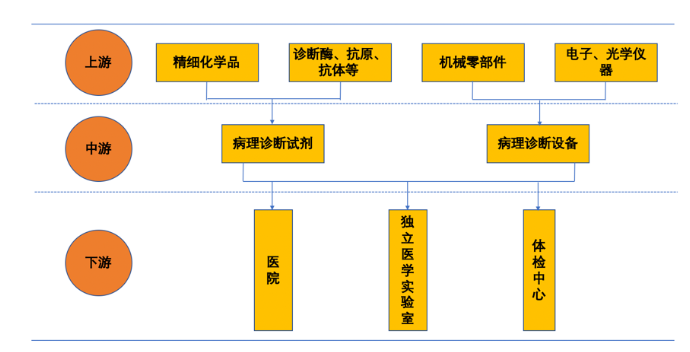 病理行業(yè)產(chǎn)業(yè)鏈包括上游原料市場、中游試劑設(shè)備市場和下游需求診斷市場。原料包括生物與化學(xué)原材料以及各種機(jī)械零配件,分子病理還會涉及到引物、探針等;中游包括病理診斷試劑和病理診斷儀器;下游需求主要來自于醫(yī)院、第三方獨立醫(yī)學(xué)實驗室、體檢中心、政府等。