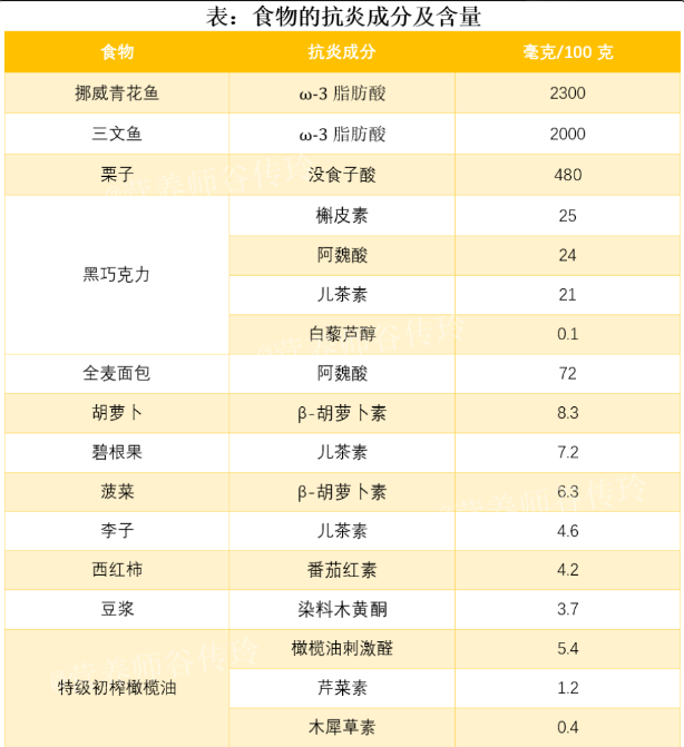 抗炎飲食可以改善體內(nèi)的炎癥因子,避免發(fā)展出疾病。比如:碳水化合物:推薦全谷物碳水化合物,比如藜麥、糙米、蕎麥、黑米等等。脂肪:多選擇單不飽和脂肪酸和多不飽和脂肪酸,比如魚蝦、貝類、亞麻籽油等含有多不飽和脂肪酸、歐米伽-3型脂肪酸。蛋白質(zhì):選優(yōu)質(zhì)蛋白質(zhì),如魚、家禽、雞蛋、瘦紅肉,以及低脂乳制品和大豆食品。蔬果:十字花科蔬菜和莓果類是最被推薦的“抗炎選手”。富含多酚、黃酮的食物:如綠茶、大豆等;香辛料:如姜黃、生姜、肉桂、肉蔻、大蒜等等在“抗炎飲食”榜上有名。⑥2023年5月國家注冊(cè)營養(yǎng)師谷傳玲根據(jù)文獻(xiàn)研究,整理出了12種“抗炎王者食物”,供大家日常飲食中參考。